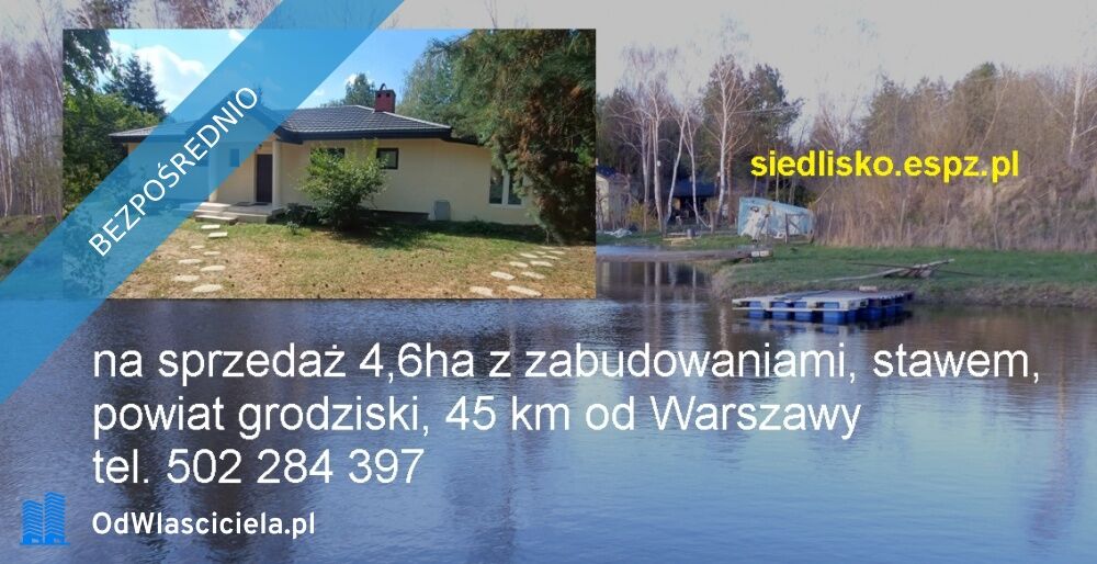Na sprzedaż posiadłość dla osób ceniących izolację od sąsiadów, a jednocześnie bliskość Warszawy - teren 4,6ha, Budy Michałowskie gm. Jaktorów. Teren podzielony na działki poniżej 1ha (ułatwienie KOWR). Na dwóch działkach zabudowania: dwa domy (pompa ciepła ziemna, fotowoltaiki), budynek gospodarczy, wiata, basen, ziemianka, staw. Na pozostałych działkach drugi staw, zadrzewienia i warunki zabudowy w trakcie załatwiania. Położenie na uboczu, ale zarazem blisko cywilizacji - do Warszawy 45km, do kolei 5km. Cały teren starannie obsadzony drzewami (ponad 20-letnie), krzewami, bardzo dużo zieleni.Cena uzależniona od ilości ziemi (działek). Cena podana w ogłoszeniu dotyczy całości.